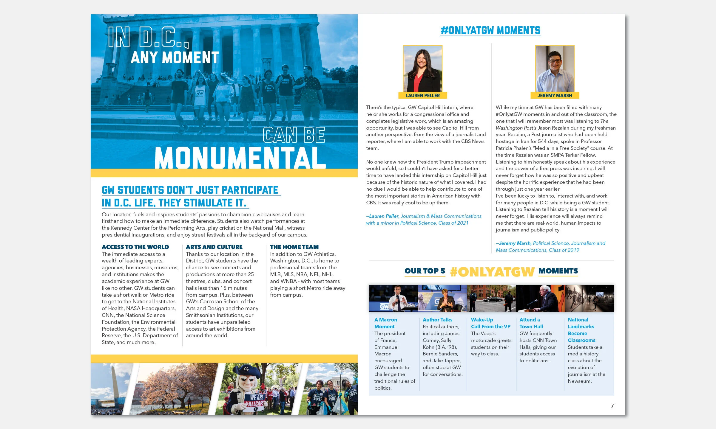 This viewbook is for incoming freshman, it includes important information on D.C., the campus and the university. (6”x9”)